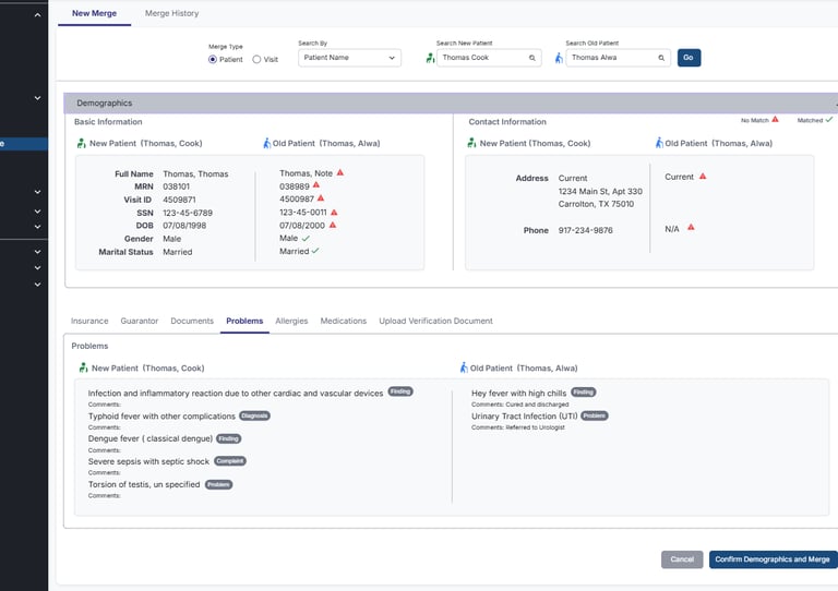 Patient merge is a high-risk administrative workflow where incorrect decisions can lead to duplicated records, lost clinical history, or patient safety issues.